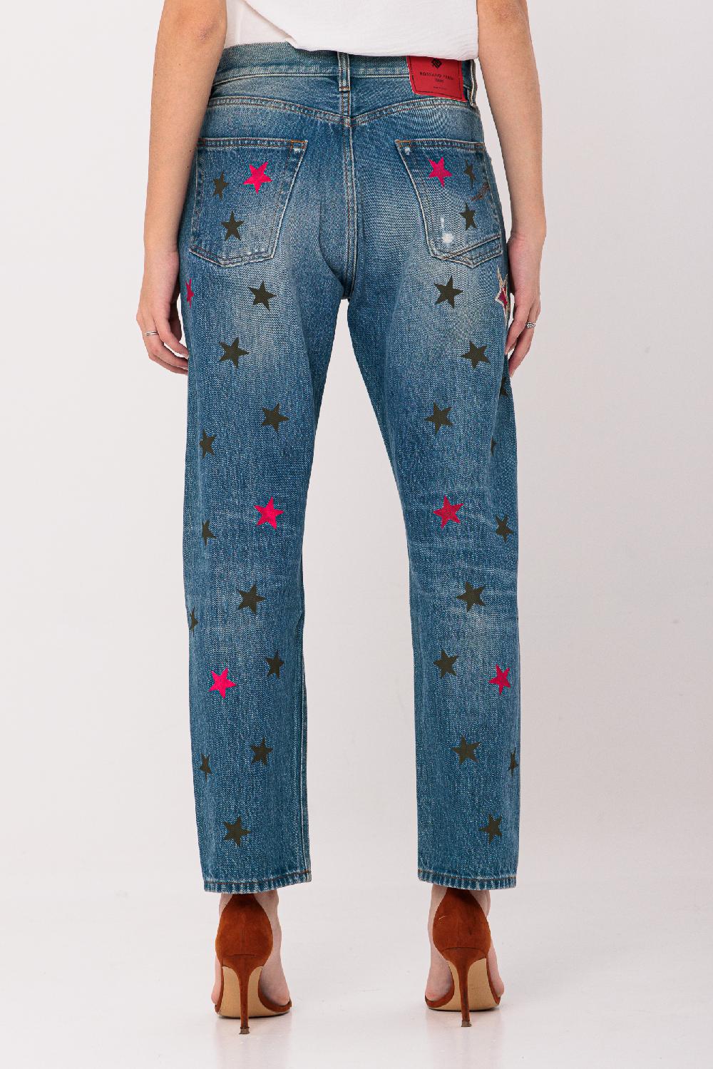 Pantalone con lavaggio denim scuro, presenta stelle dipinte a mano color rosa fluo e verde scuro sul fronte e retro.