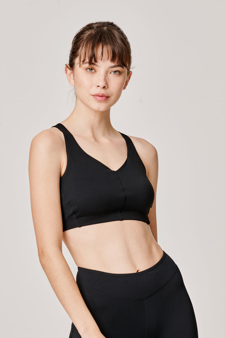 Reggiseno sportivo in tessuto 4 way stretch con scollo a V, coppe traspiranti e inserto di tulle stampa pizzo sulla schiena che lo rendono un top essenziale per la palestra e non. Perfetto per le discipline a terra come yoga, pilates e danza.