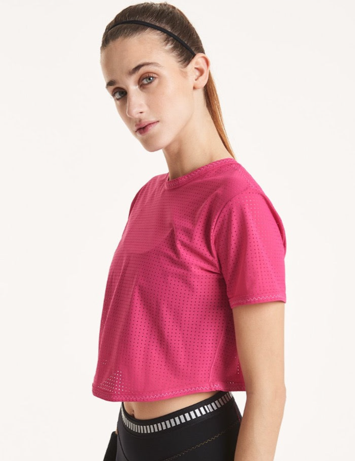 Lascia respirare il corpo con questa t-shirt fucsia da palestra in tessuto mesh traforato e cuciture a contrasto che la rendono un capo versatile adatto ad ogni momento della giornata.